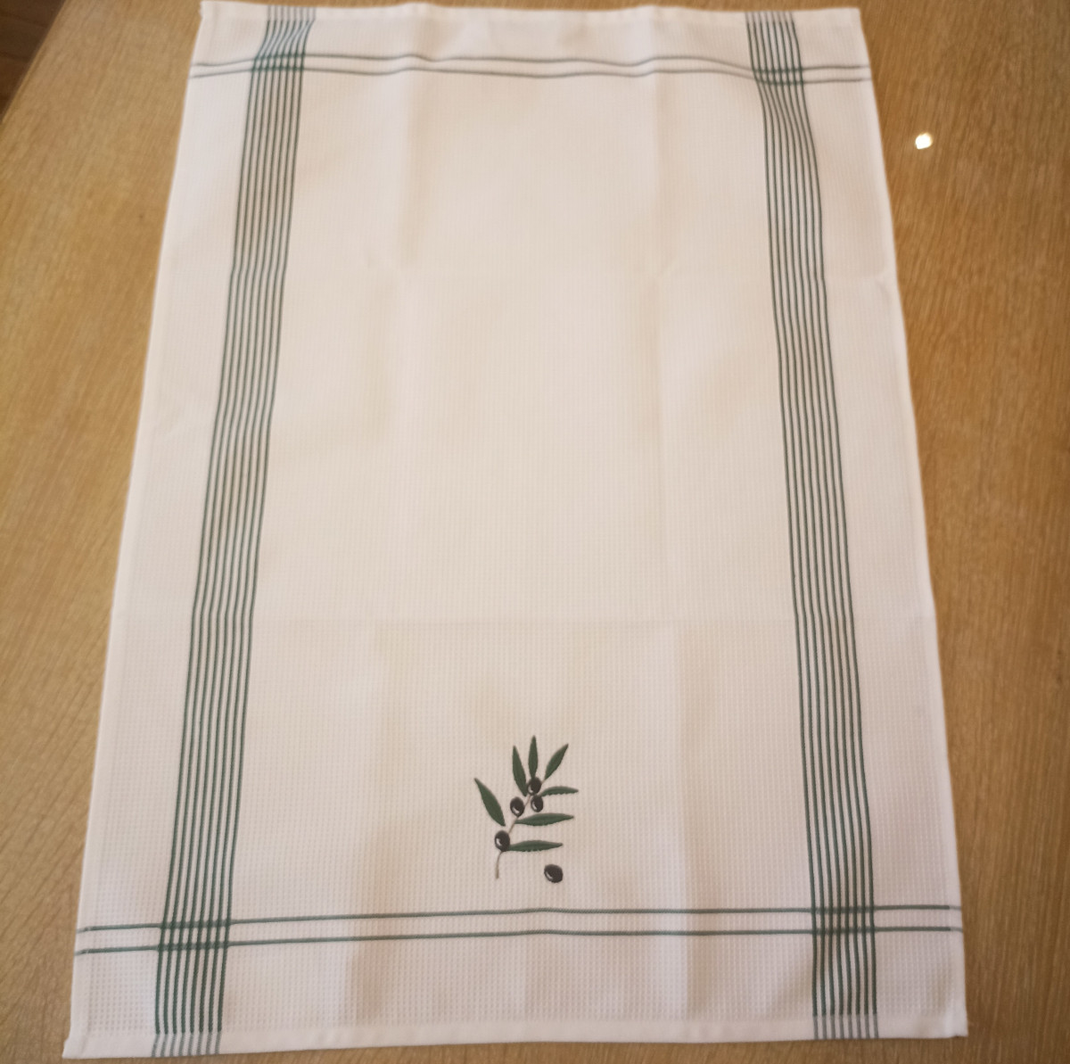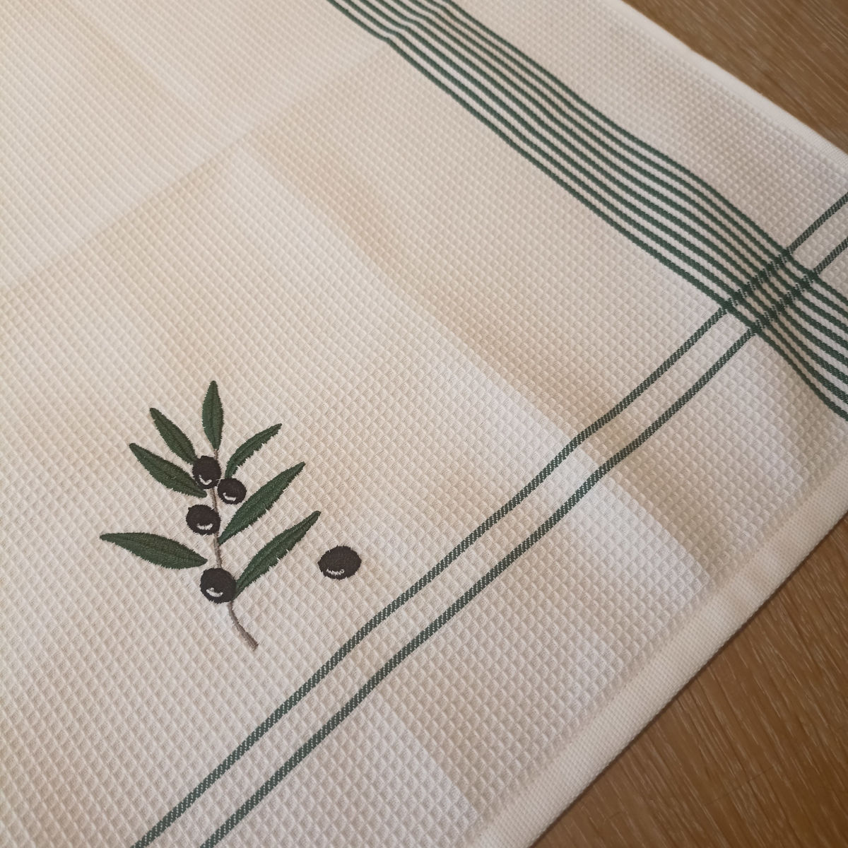 Torchon blanc brodé d'un brin d'olivier. Tissage nid d'abeille.