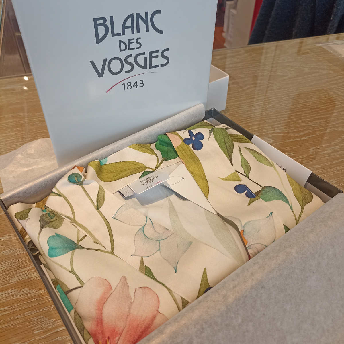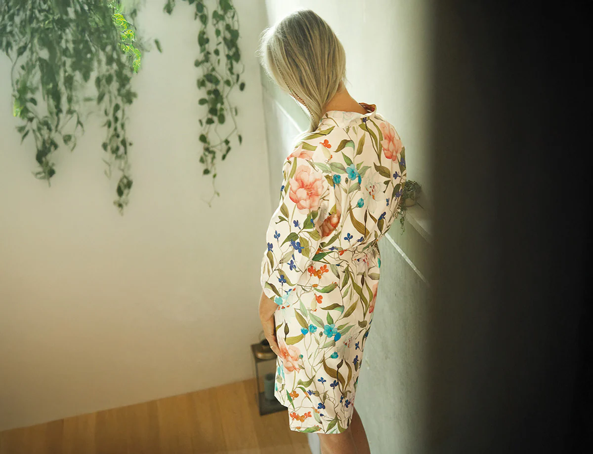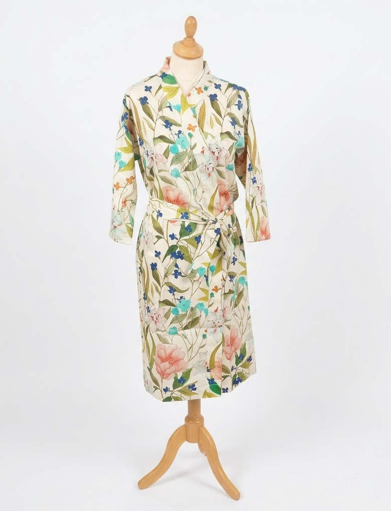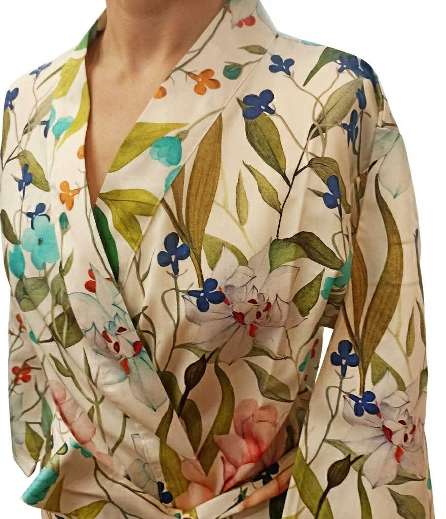 Déshabillé avec motif floral imprimé. En matière naturelle, il est très confortable à porter.